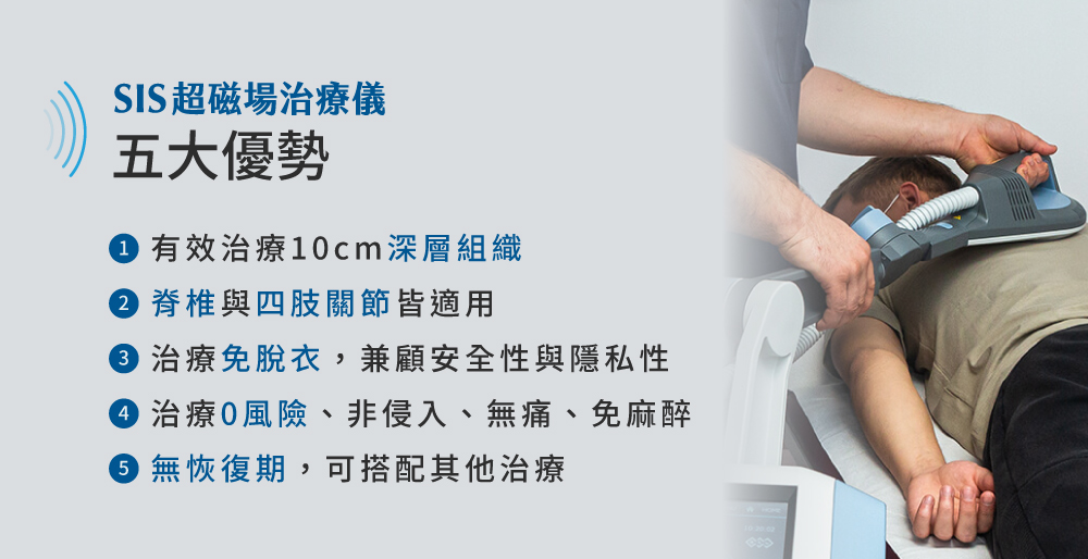 SIS 超能量磁場治療屬於非侵入式照護,單次療程 15–50 分鐘,過程中不需要脫衣或直接接觸皮膚。